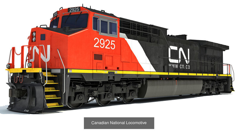 High detailed Canadian National locomotive with 6 railroad car collection.For additional info, turntables and more preview renders, or if you want to get separate models, please search our catalog.