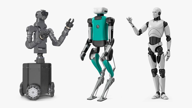 Set of contemporary artificial intelligence (AI) robot (bot) type machinery items, which are robotic machines, and which are humanoid robots, and which are mobile robot machines which can communicate with humans.