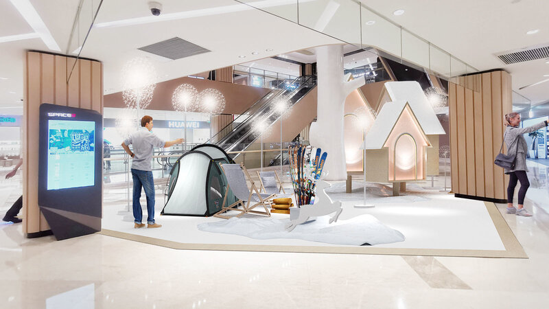mall display pop up store Warm Winter Olympics ice and snow cabin tent dandelion